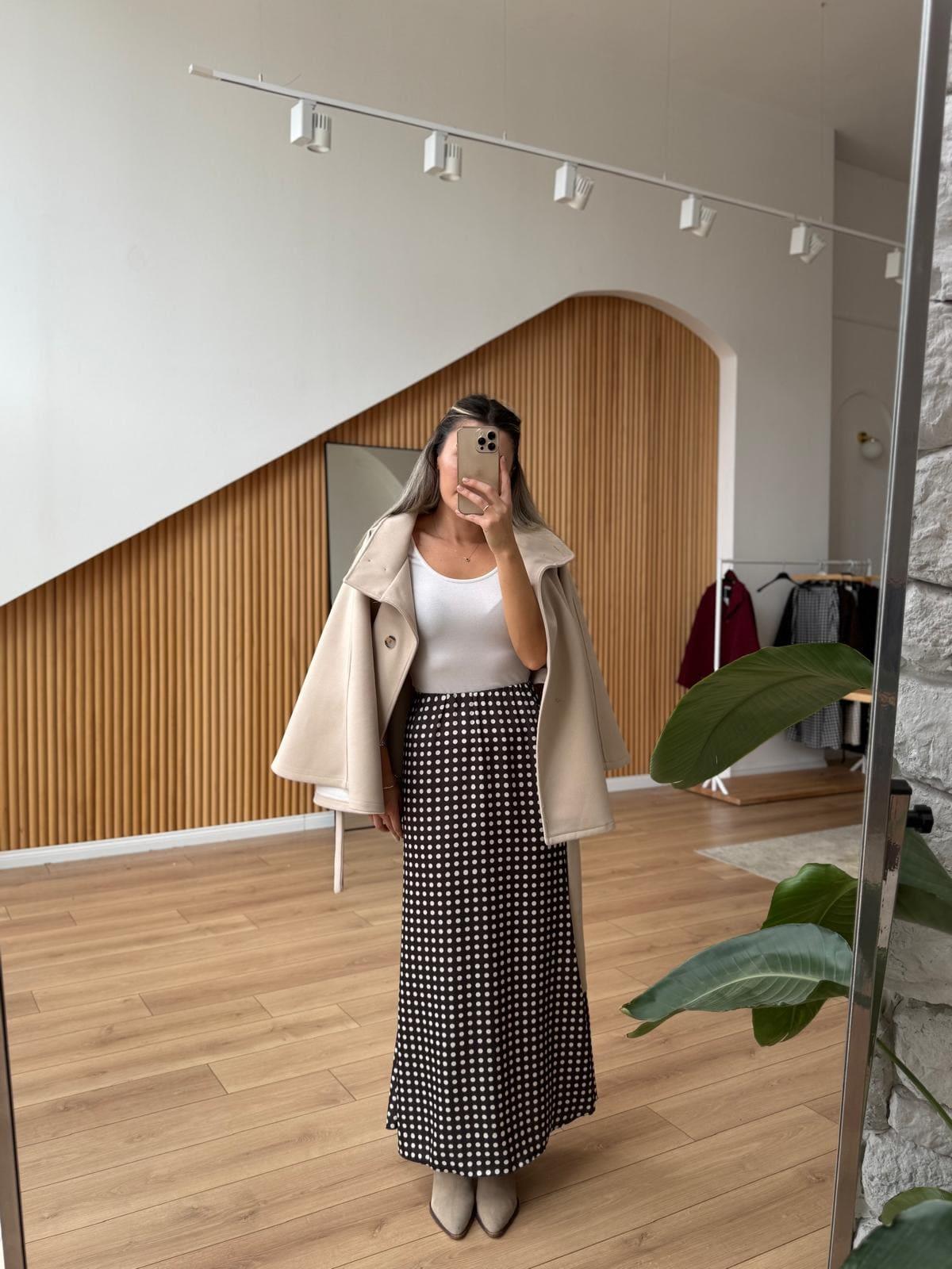 Beyaz Puantiyeli Siyah Saten Etek Kahverengi Puantiyeli Krem Rengi Saten Etek