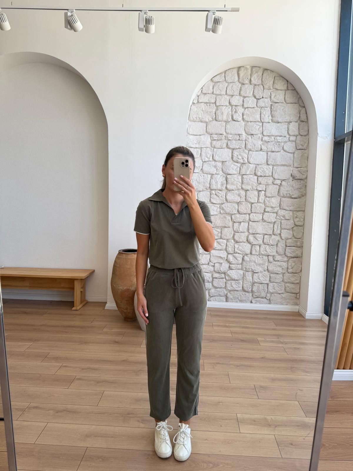 Beyaz Biyeli Kısa Kollu Tshirt Pantalon Haki Takım