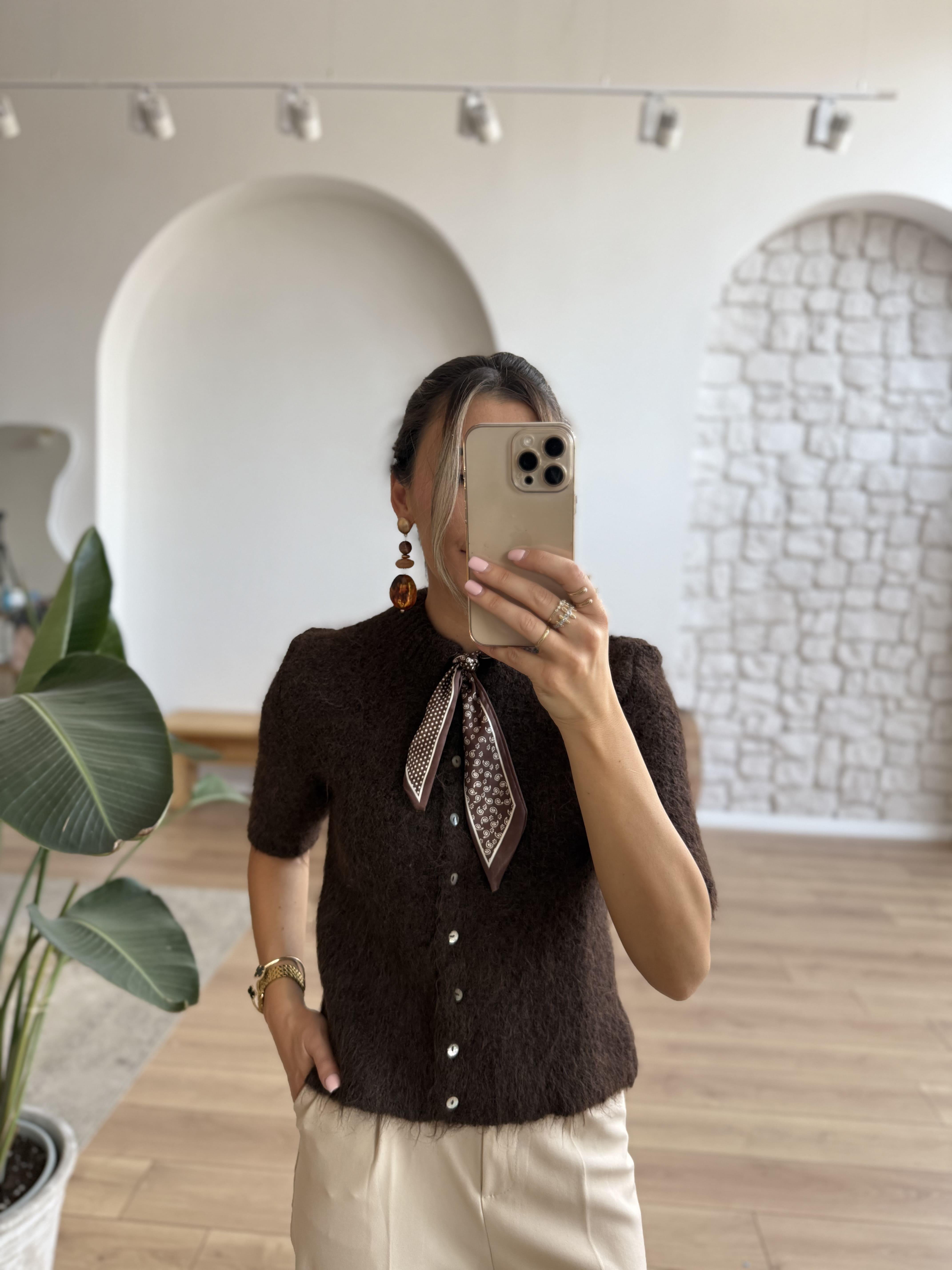 Dova Kahverengi Kısa Kollu Fularlı Triko
