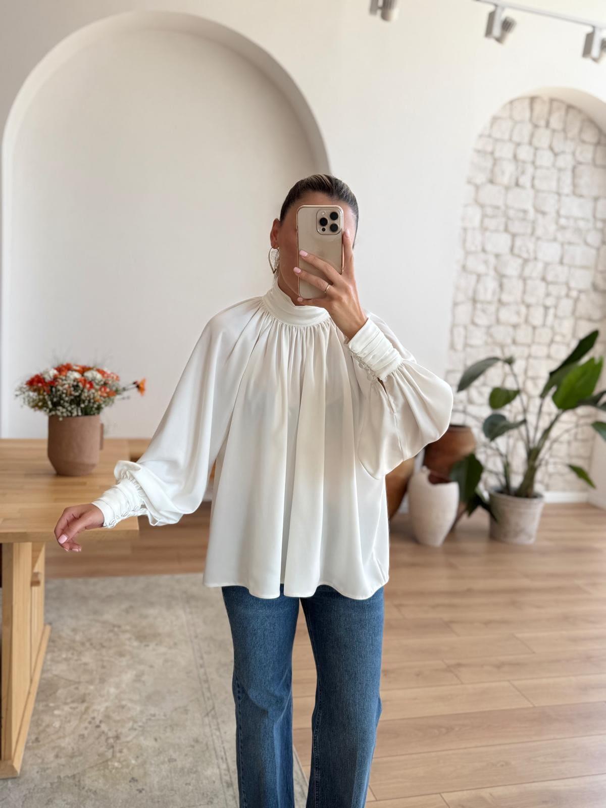 Drapeli Balon Kol Lacivert Saten Bluz Drapeli Balon Kol Camel Saten Bluz