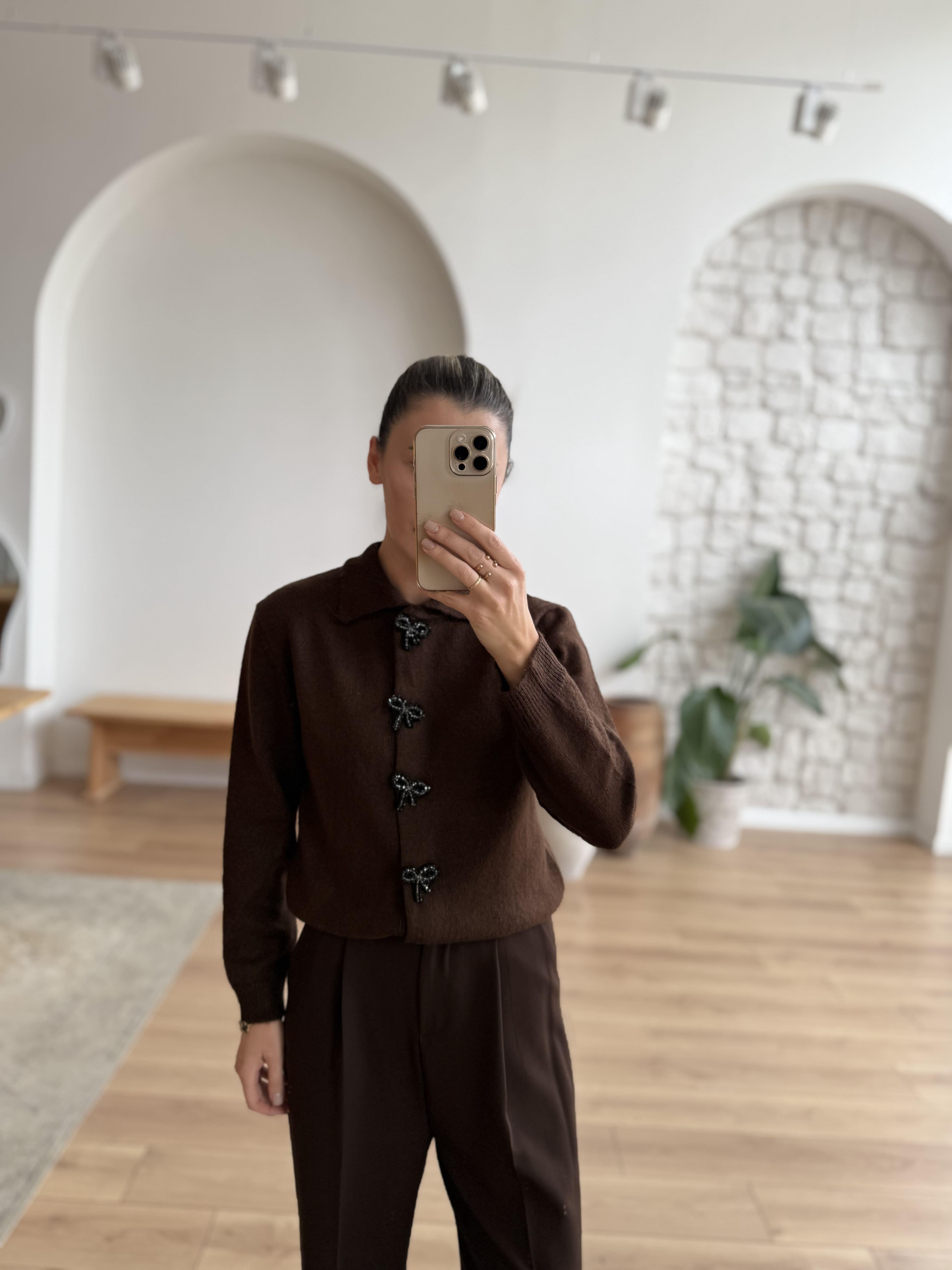 Fiyonk Düğmeli Uzun Kollu Kahverengi Hırka