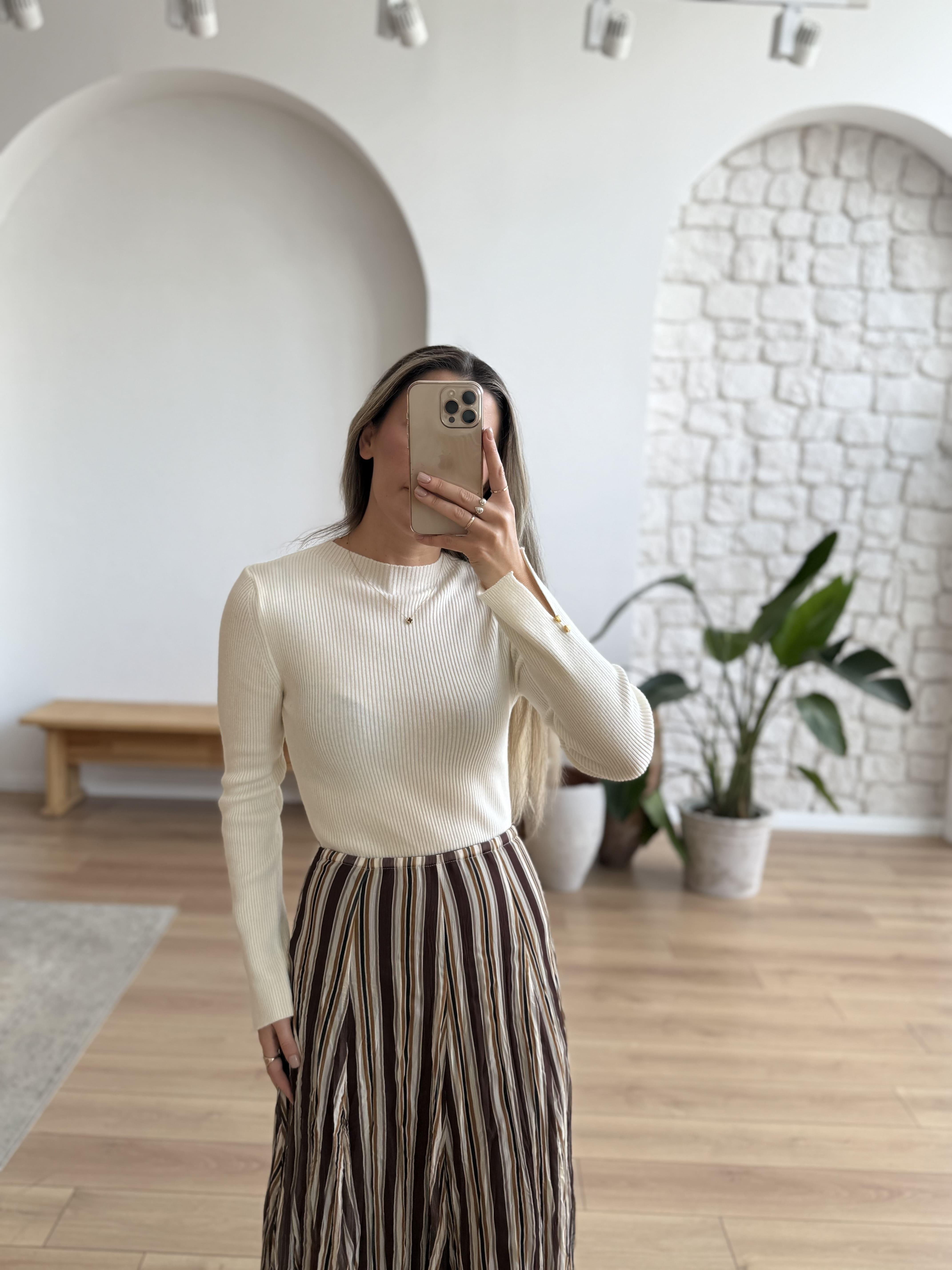 Kolu Aksesuar Detaylı Ekru Fitilli Uzun Kollu Triko