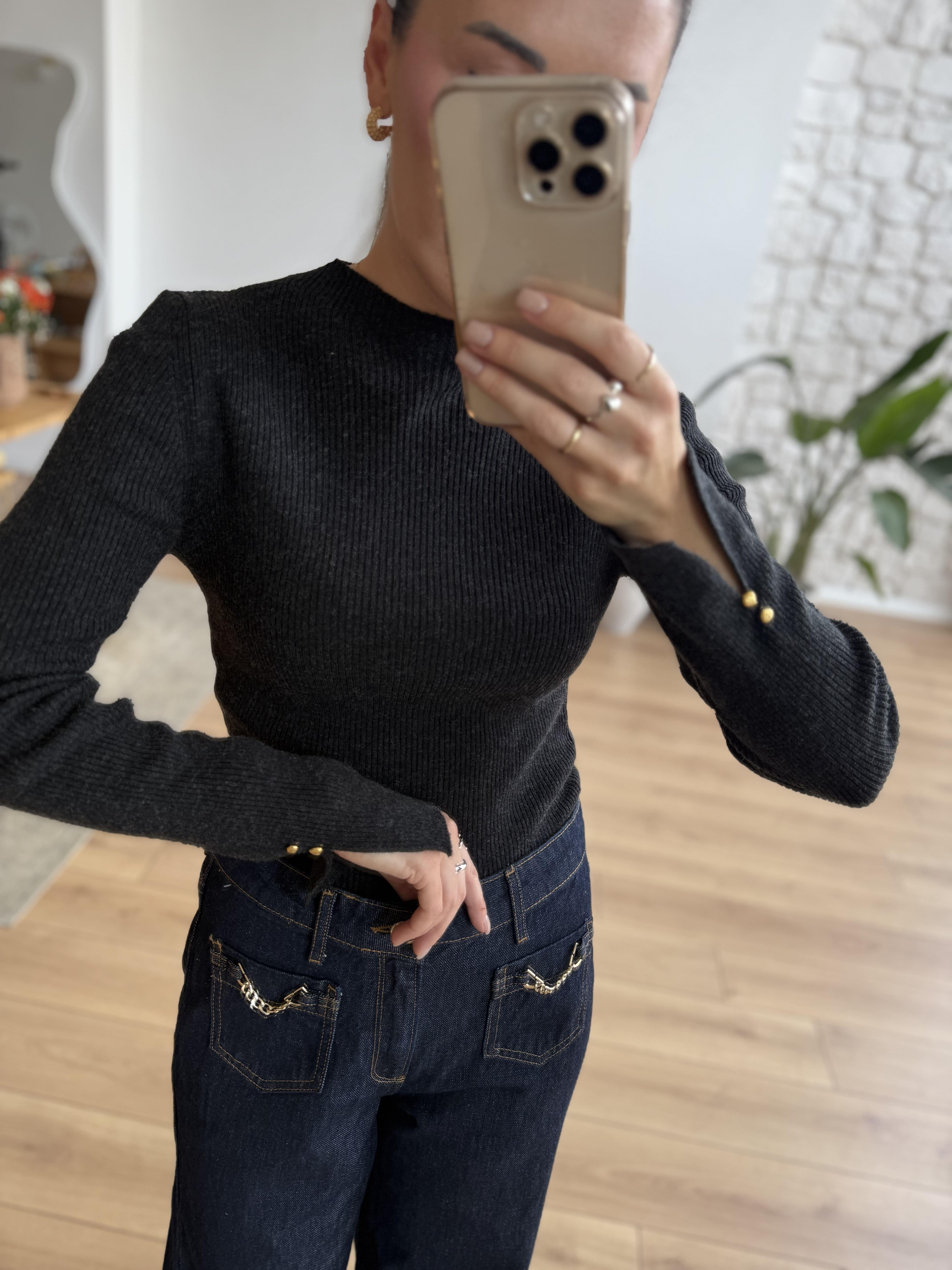 Kolu Aksesuar Detaylı Gri Fitilli Uzun Kollu Triko