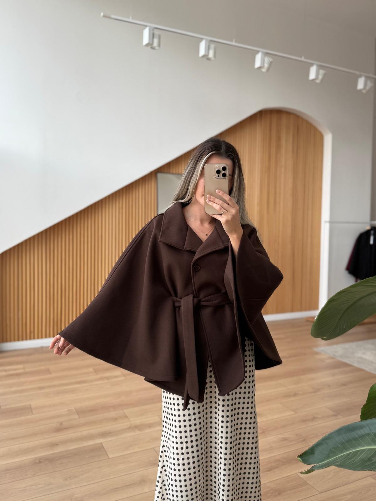 Kuşaklı Kahverengi Kaşe Panço