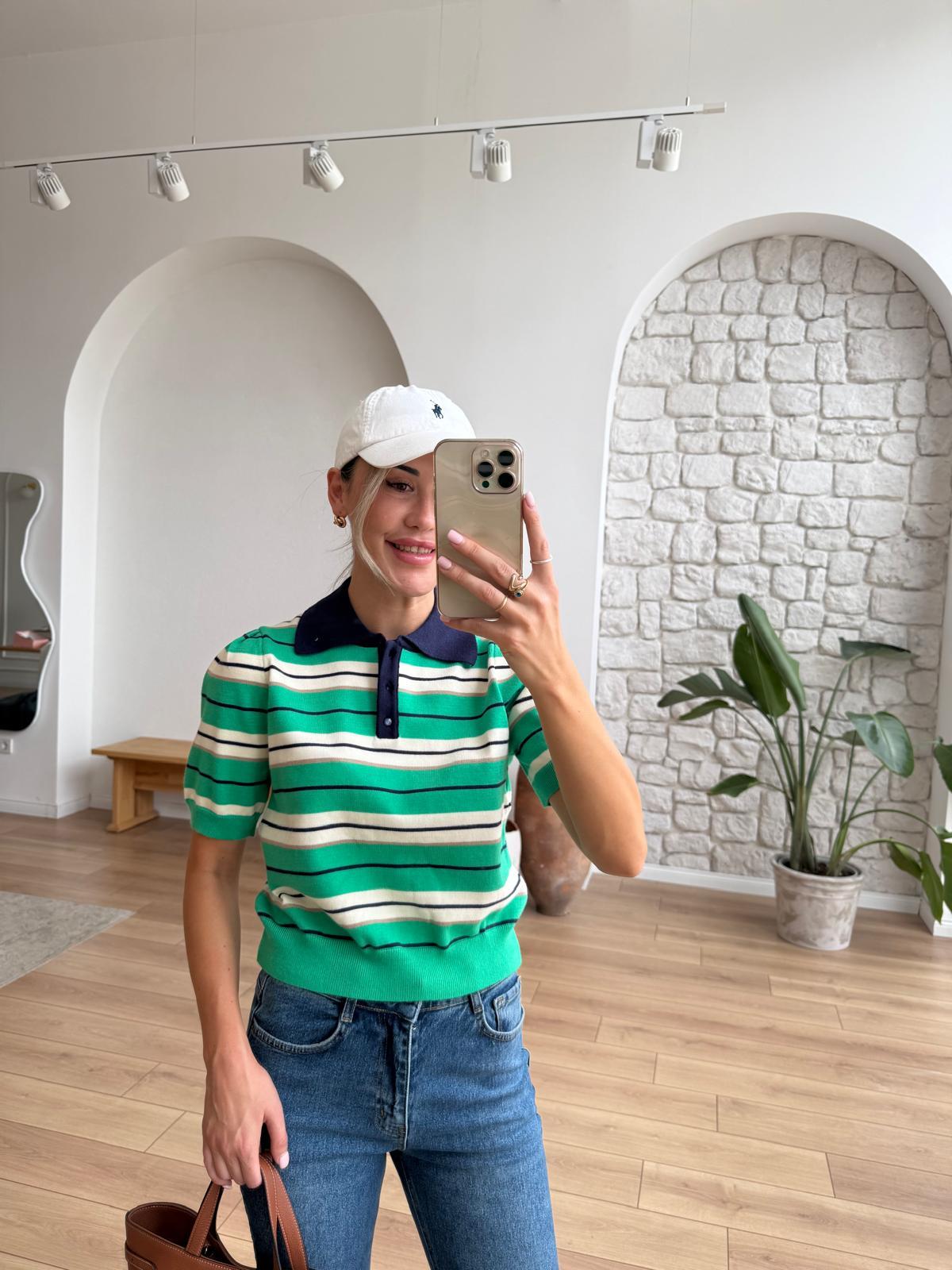Polo Yaka Çizgili Yeşil Triko Bluz