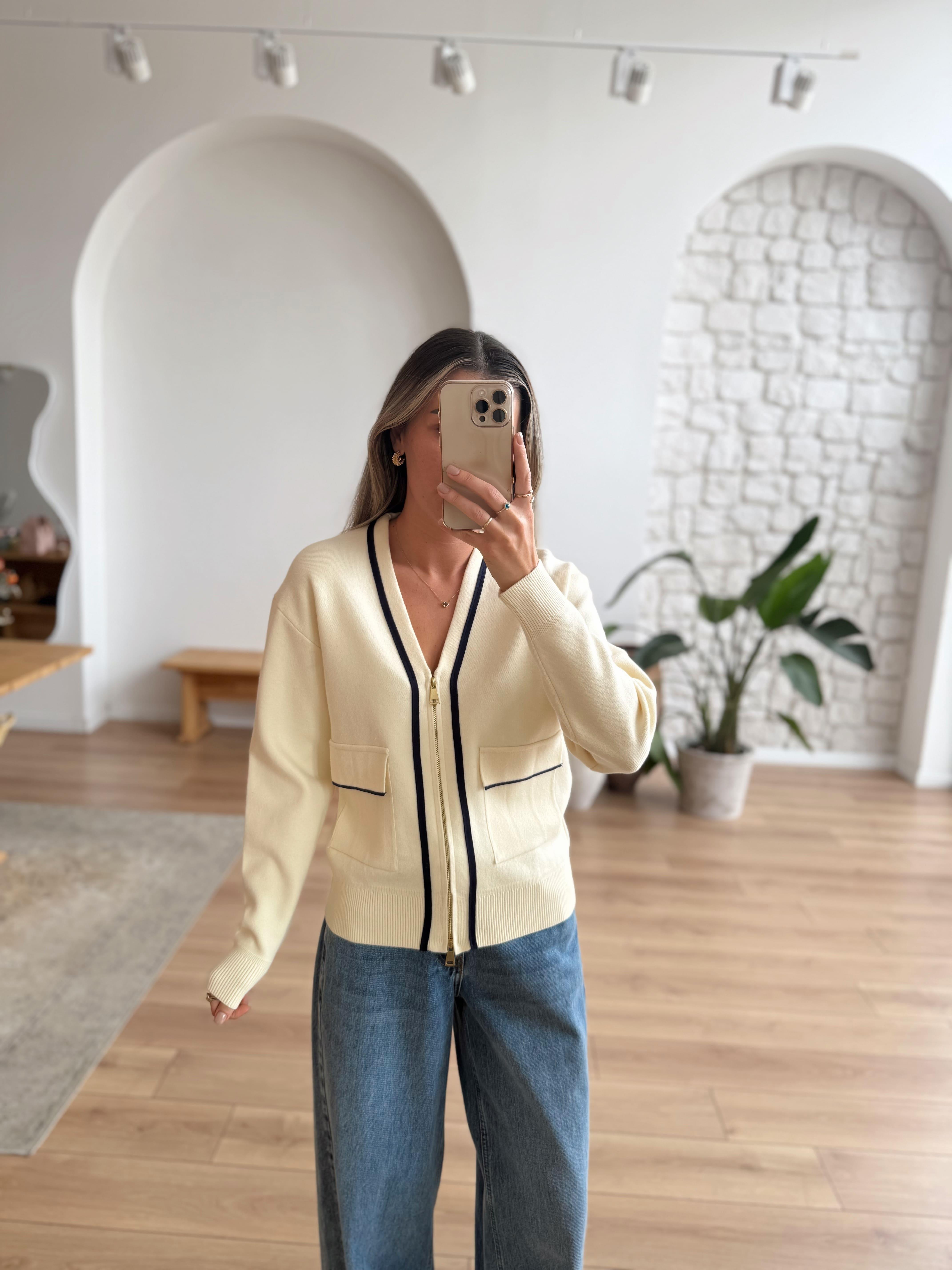 Premium Kalite Lacivert Biyeli Krem Rengi Triko Ceket