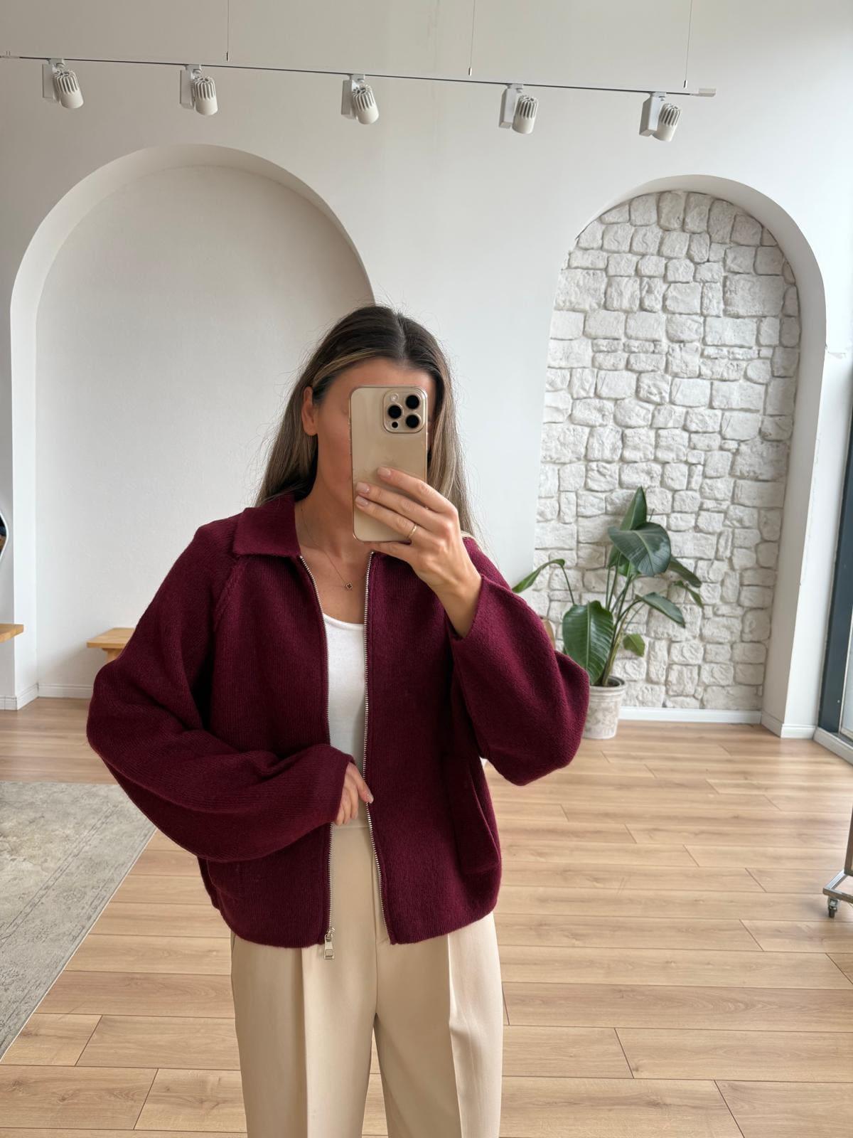 Reglan Kol Fermuarlı Bordo Triko Ceket