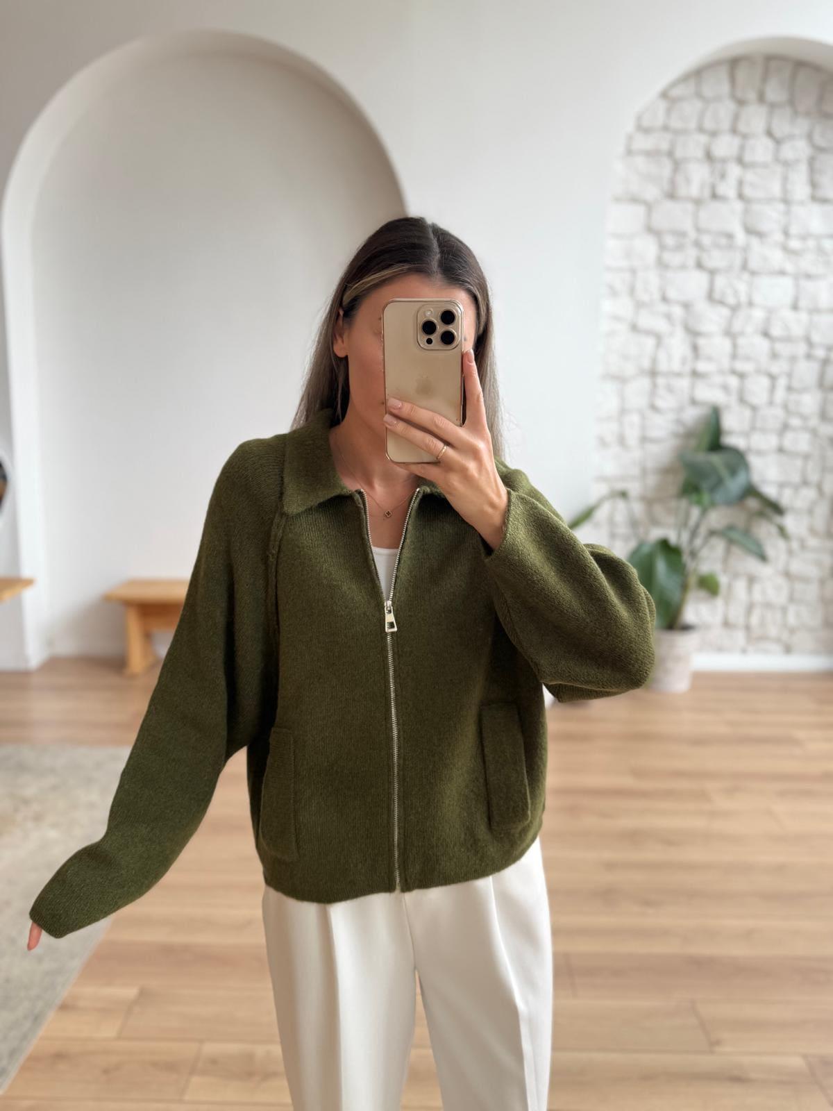 Reglan Kol Fermuarlı Haki Triko Ceket