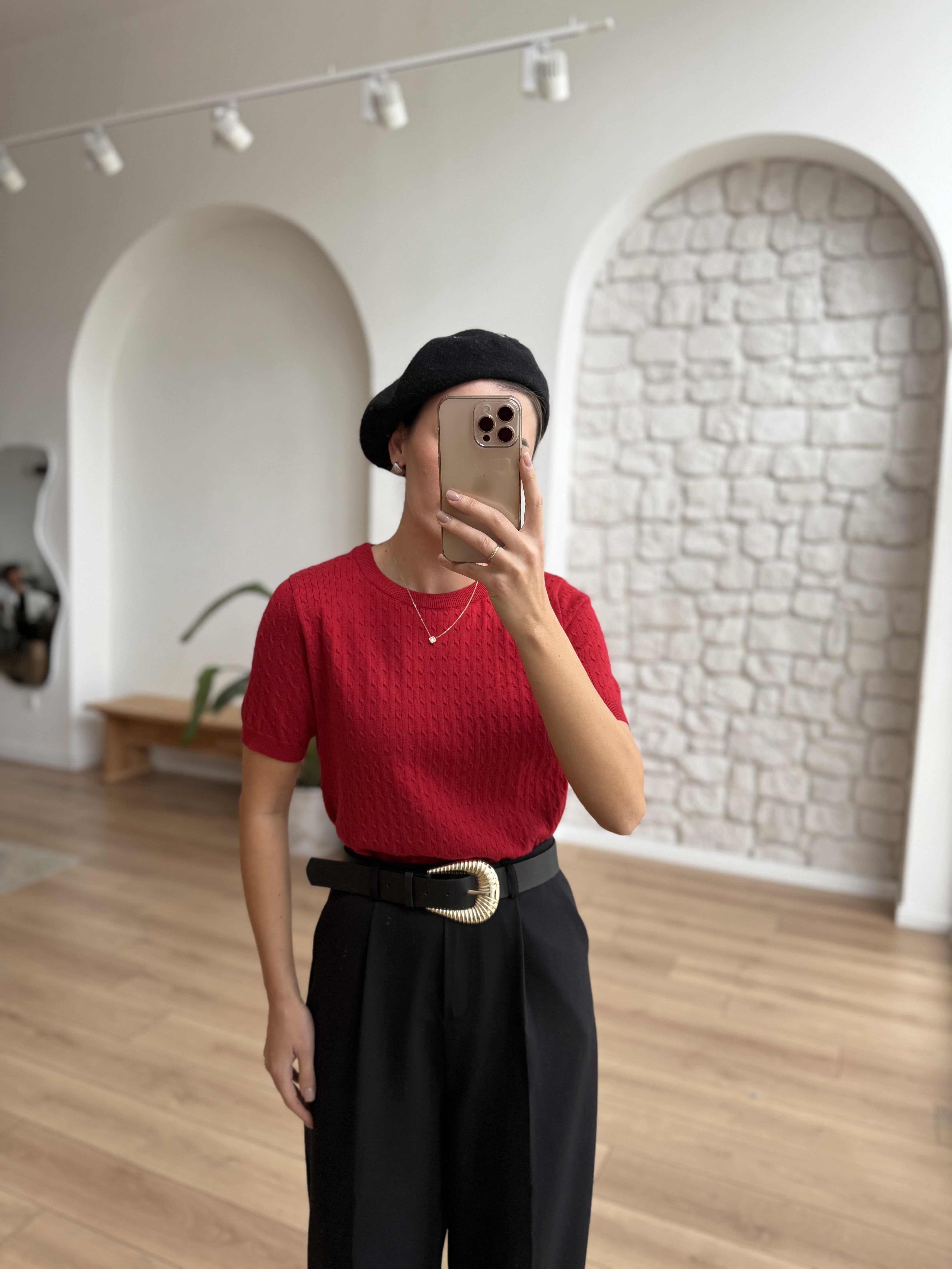 Saç Örgüsü Kırmızı Triko Bluz
