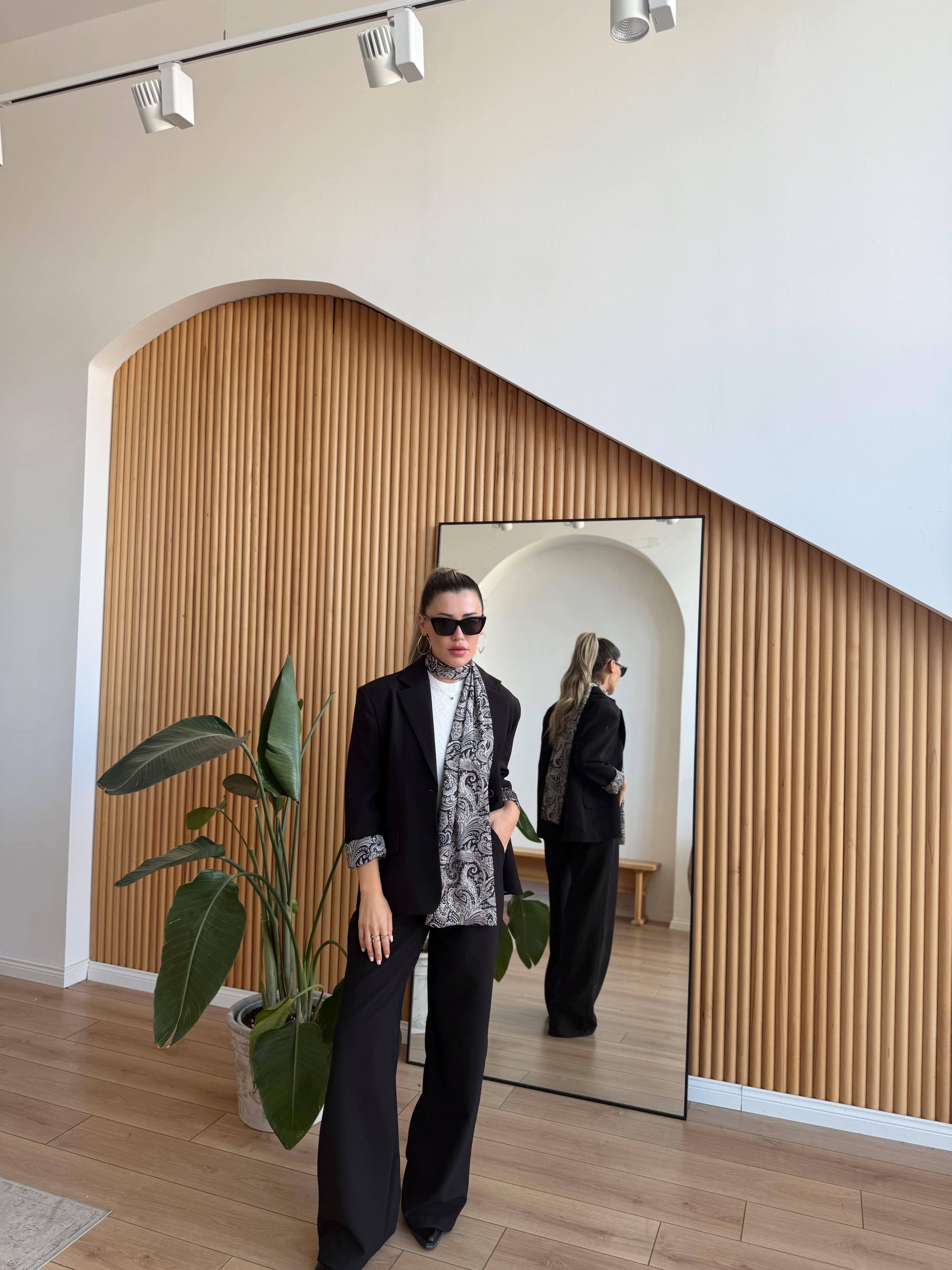 Şal Detaylı Siyah Blazer ve Pantolon Takım