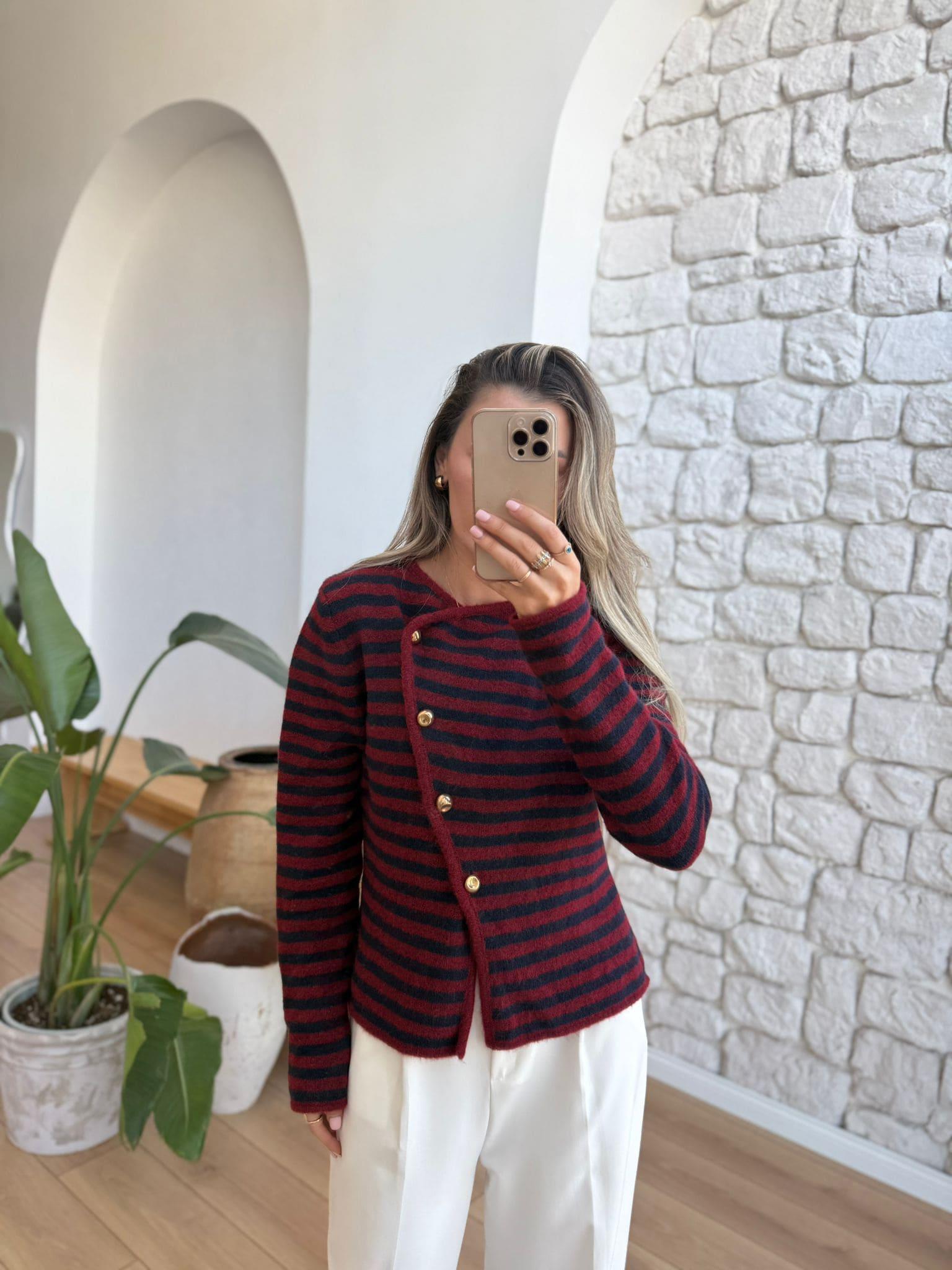 Yaka Detaylı Lacivert Çizgili Hırka Yaka Detaylı Kahverengi Çizgili Hırka