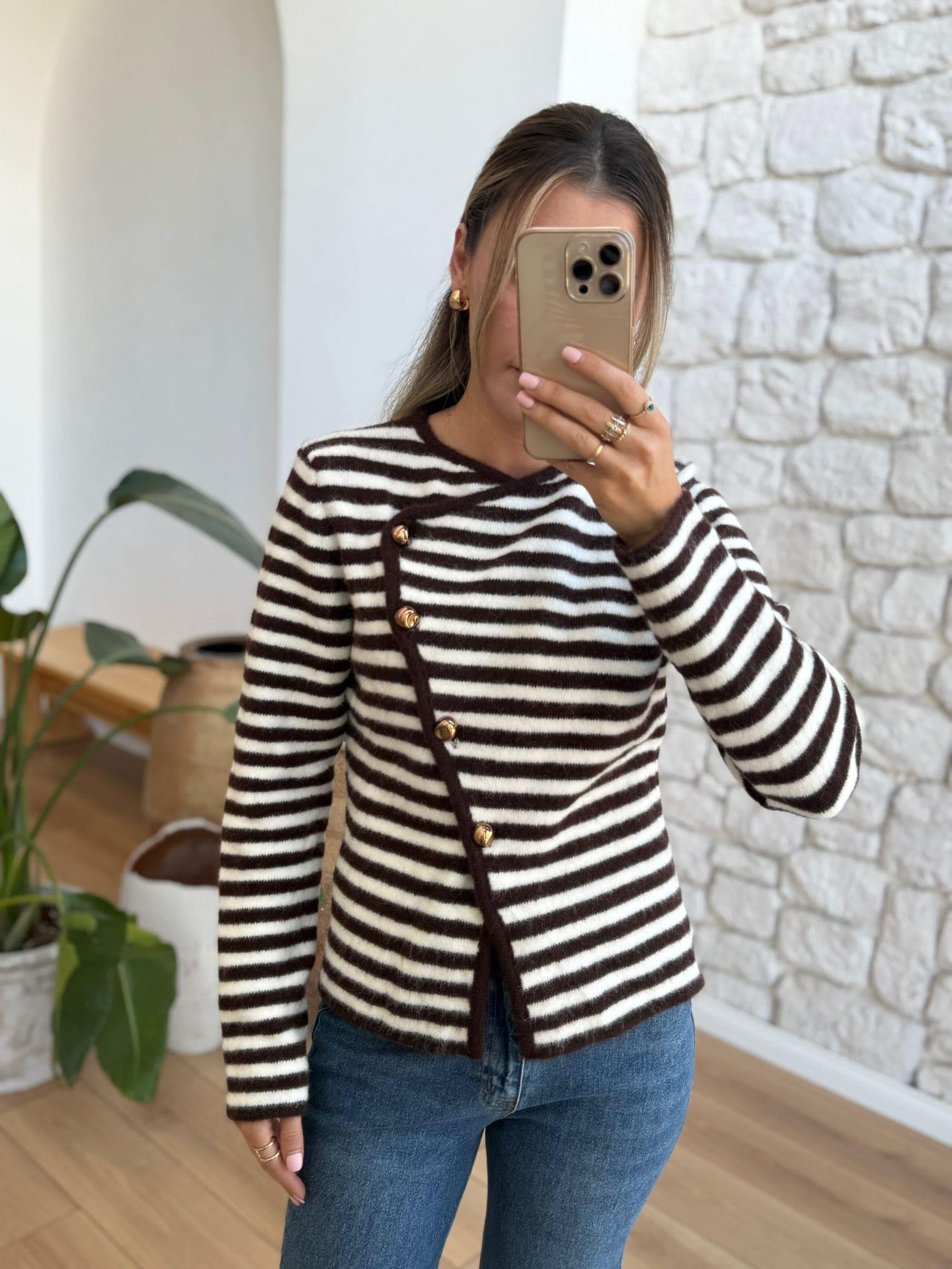 Yaka Detaylı Kahverengi Çizgili Hırka