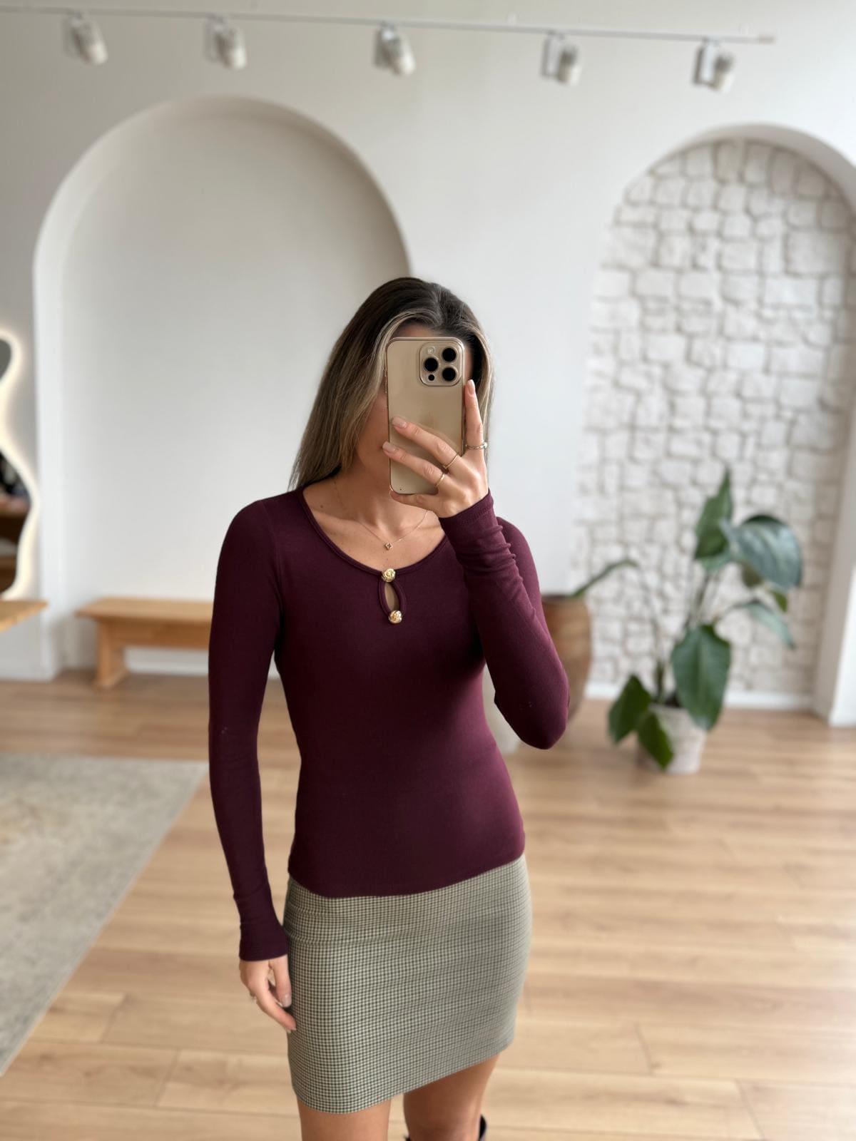Yakası Aksesuarlı Mürdüm Bluz